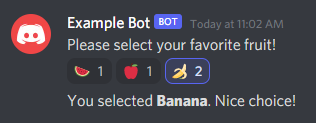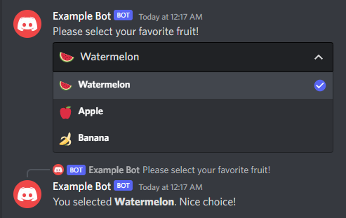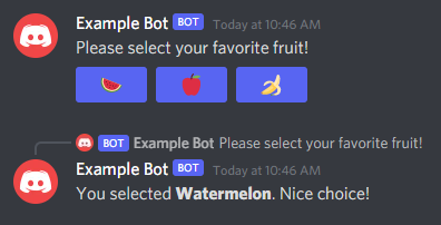 await result.intr.reply(`Oh, **${result.value}**? That one's hilarious!`);let prompt = await channel.send('Please select your favorite fruit!');