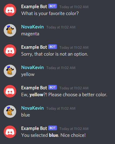 await channel.send(`You selected **${favoriteFruit}**. Nice choice!`);await channel.send('What is your favorite color?');