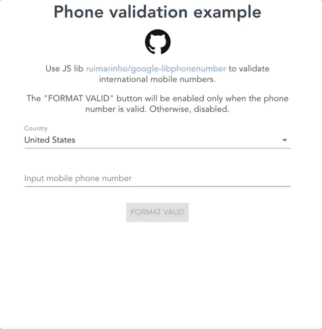 This is a simple demo app demonstrating how to use ruimarinho/google-libphonenumber to validate international mobile numbers.
