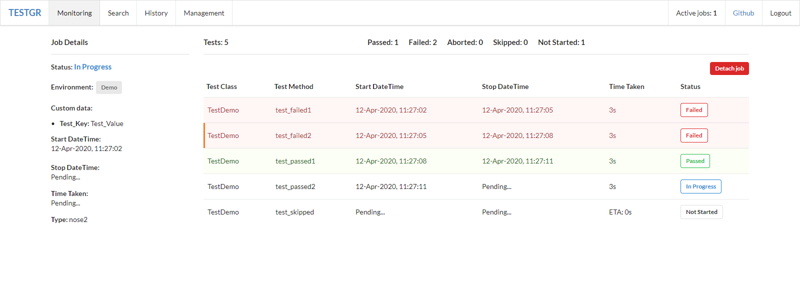 nose2 and pytest frameworks have several methods for providing details of test runs and tests before and after test execution. To connect Testgr and these frameworks - you need to use nose2-rt or pytest-rt plugins (depending on your framework). Testgr service collects all data produced by plugins and store it in the database. If some test is in running, passed, failed or skipped state - plugin will send updated data to Testgr and user will see test execution status in real-time.