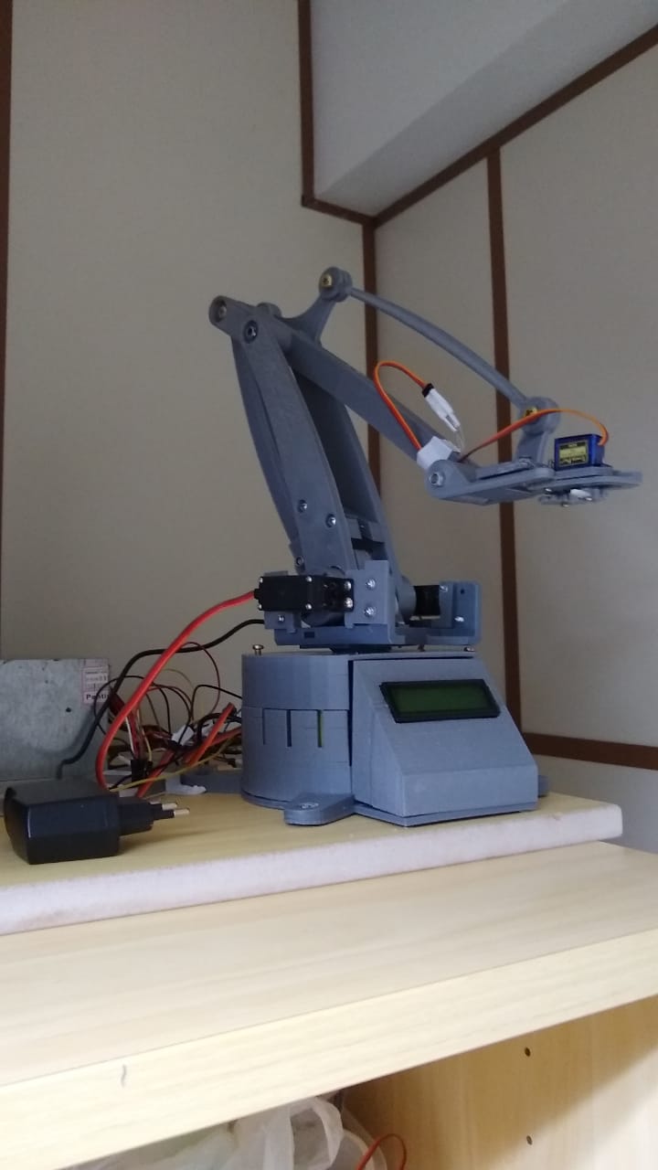 A função do Arduino neste módulo é de receber os dados enviados do Module 1 e com isso gerar instruções para o jogador através do Display LCD e ao mesmo tempo enviar um sinal PWM aos Servo-motores para assim mover o Braço Robótico de 4 eixos impresso em 3D como desejar, dentro dos movimentos que os Servo-motores permitem e são eles: