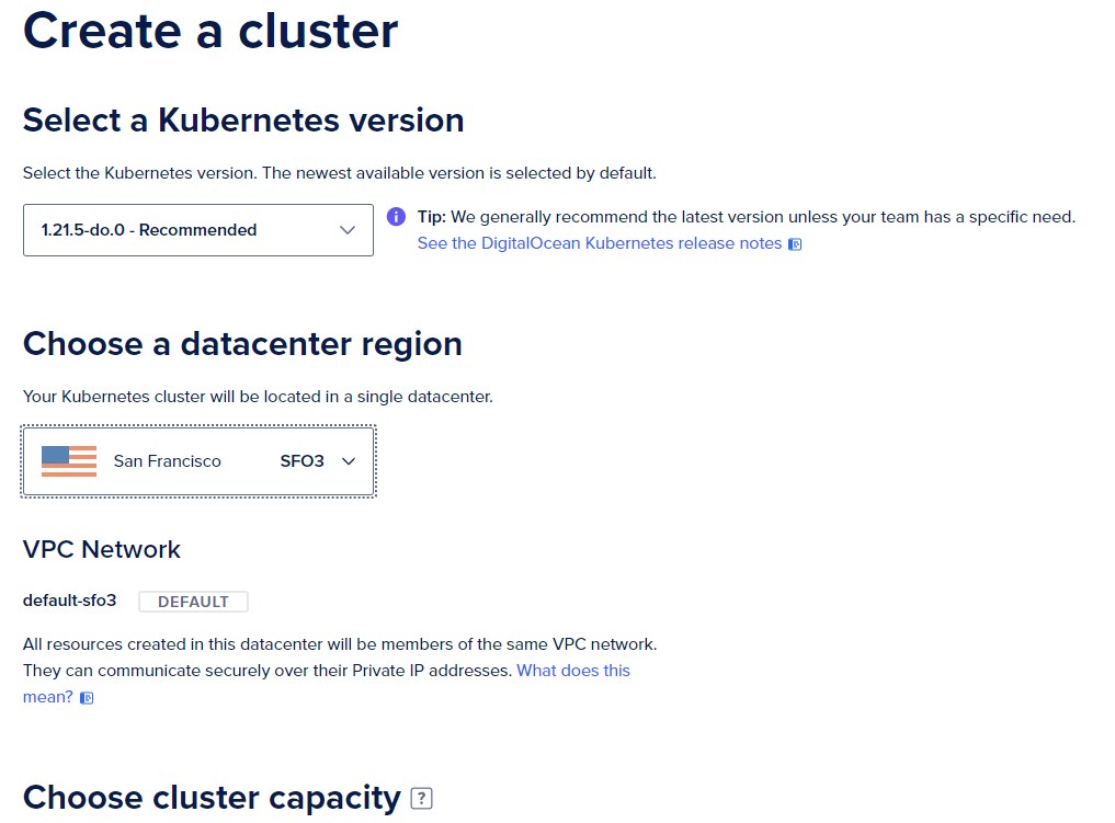 Head to https://cloud.digitalocean.com/kubernetes/clusters and click Create a Kubernetes Cluster.