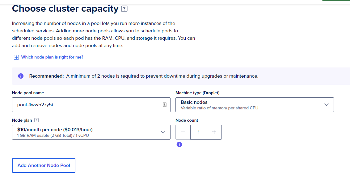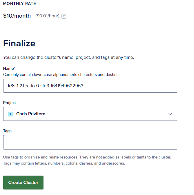 - You'll need to pick a region, K8S version, and a name, we're just going to go with the defaults here for everything, and two of the smallest nodes (to conserve credits), in production you'd likely want a full 3 node HA control plane and a backup/restore strategy for your crossplane cluster.