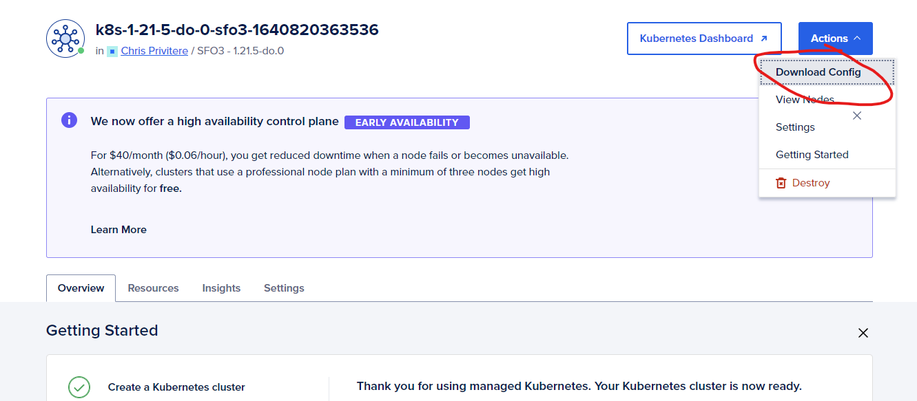 Next we download the kubeconfig (Download Config) from the cluster page in the digital ocean panel.