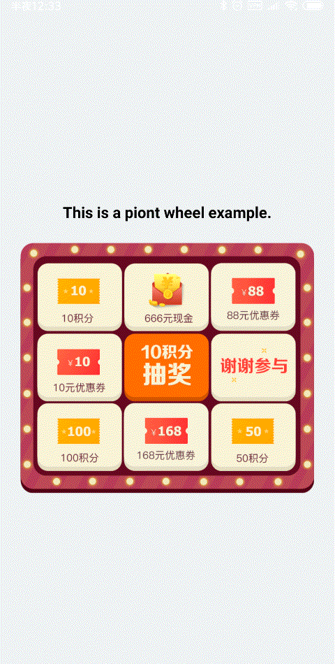 $ npm i react-native-super-lottery --save转盘只支持九宫格。